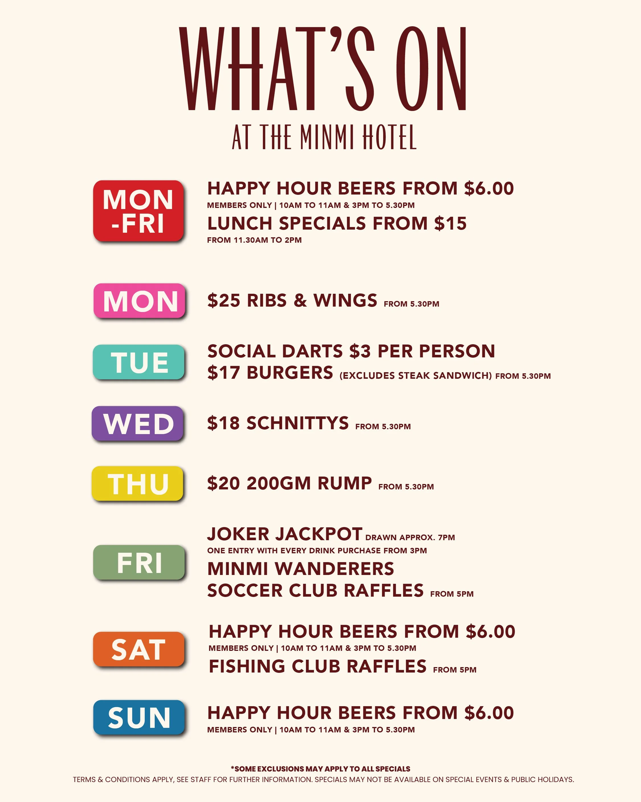 What’s on There’s always something happening at The Minmi Hotel!Enjoy live music, tasty lunch specials & Friday night raffles. WEEKLY SPECIALS